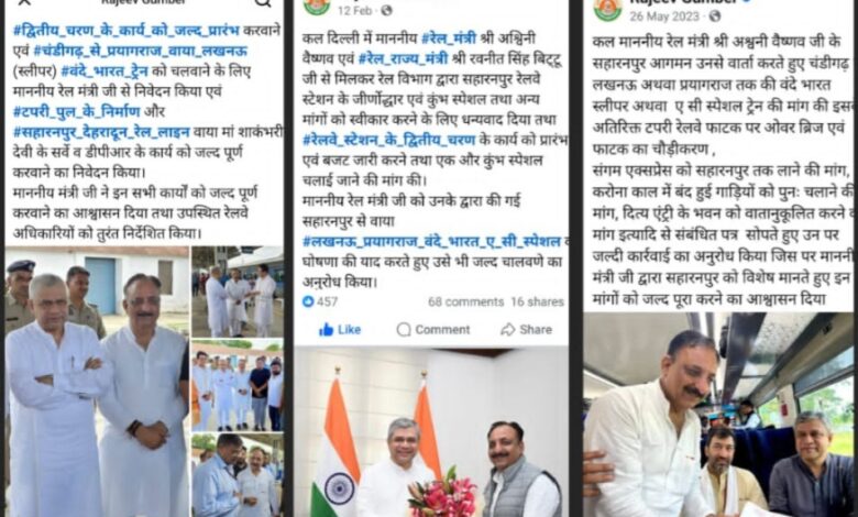 रेल मंत्री अश्विनी वैष्णव ने सहारनपुर से लखनऊ तक वंदे भारत एक्सप्रेस चलाने की घोषणा की है। सदर विधायक द्वारा कई बार रेल मंत्री जी के लोकसभा चुनाव प्रभारी रहते हुए सहारनपुर दौरे के दौरान व कई बार दिल्ली में मिलकर सहारनपुर से लखनऊ तक वंदे भारत एक्सप्रेस चलाने की मांग की थी जिस पर मां रेल मंत्री जी ने उपरोक्त ट्रेन को जल्द चलवाने का आश्वासन दिया था। रेल मंत्री अश्विनी वैष्णव ने अपना वायदा पूरा करते हुए सहारनपुर से लखनऊ तक वंदे भारत एक्सप्रेस चलाने की मांग को पूरा करने के लिए सहारनपुर वासियों की ओर से रेल मंत्री जी का बहुत बहुत आभार एवं धन्यवाद।