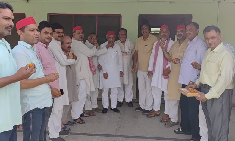 आजम खान की रिहाई होने पर समाजवादी पार्टी के कार्यकर्ताओं ने मिठाई बांटकर अपनी खुशी का इजहार किया