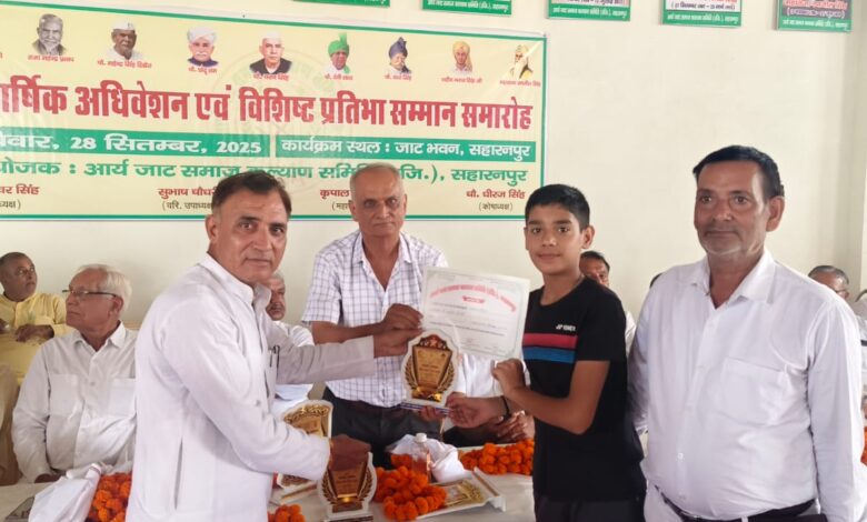 सहारनपुर। दिल्ली रोड के चुनौती से टपरी बायपास रोड स्थित विशाल जाट भवन में आर्य जाट समाज कल्याण समिति द्वारा द्विवार्षिक प्रतिभा सम्मान समारोह समिति के अध्यक्ष चौधरी बख्तावर सिंह जी की अध्यक्षता में संपन्न हुआ। जिसमें हाई स्कूल इंटर इंटरमीडिएट हायर एजुकेशन सहित व्यावसायिक एजुकेशन और आई पी एस आई ए इस व खिलाड़ियों सहित अन्य क्षेत्रों में जाट समाज को गोर्बान्वित करने वाले 92 प्रतिभाओं को सम्मानित किया गया। कार्यक्रम को संबोधित करते हुए राष्ट्रीय जाट महासभा भारत के राष्ट्रीय प्रवक्ता डॉ अशोक मलिक ने प्रतिभाओ को प्रमाण पत्र व स्मृति चिन्ह भेंट करते हुए कहा की हमें गर्व है कि हमारे अमर शहीद भगत सिंह जैसे अनेको पूर्वजों ने देश के लिए कुर्बानियां दी है।
