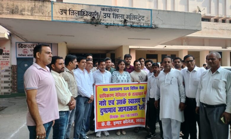 हरिद्वार, लक्सर। उत्तराखण्ड राज्य विधिक सेवा प्राधिकरण, नैनीताल के निर्देशन में आज लक्सर में नशा मुक्ति एवं उसके दुष्प्रभावों के प्रति जन-जागरूकता अभियान का आयोजन किया गया। यह कार्यक्रम स्वास्थ्य विभाग, औषधि मानक नियंत्रण संगठन एवं न्यायिक अधिकारियों की संयुक्त टीम के सहयोग से संपन्न हुआ। कार्यक्रम के अंतर्गत जन-जागरूकता रैली का आयोजन किया गया, जिसे लक्सर बालावाली रोड से तहसील लक्सर तक निकाला गया। रैली में के.वी. इंटर कॉलेज एवं आई.पी. इंटर कॉलेज के छात्र-छात्राओं, अध्यापकगण, आमजन, अधिवक्ताओं तथा मेडिकल स्टोर संचालकों ने बढ़-चढ़कर भाग लिया।
