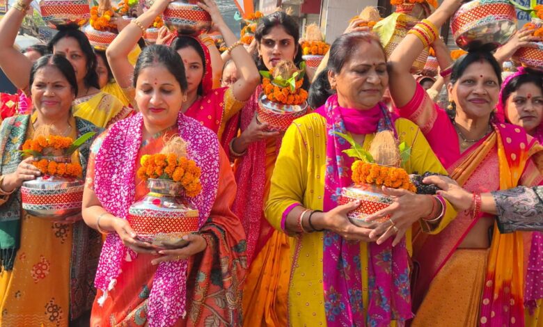 रुड़की। सिविल लाइन स्थित शिव मंदिर में श्री विष्णु महायज्ञ और श्री भागवत कथा के शुभारंभ अवसर पर नगर में भव्य कलश यात्रा निकाली गई। श्री विद्या ज्योतिष संस्थान द्वारा आयोजित शोभायात्रा में 101 महिलाओं ने कलश लेकर नगर के विभिन्न मार्गों से होते हुए शोभायात्रा का मंदिर परिसर में समापन किया।
