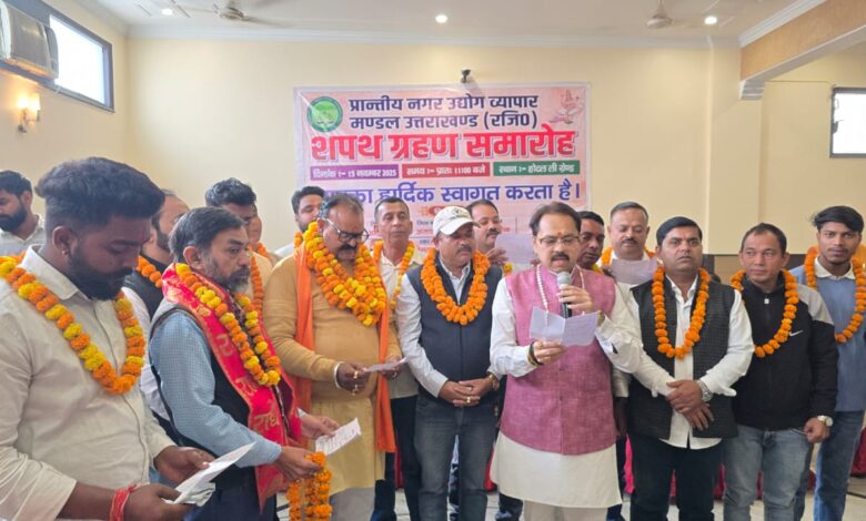 हरिद्वार। प्रांतीय नगर उद्योग व्यापार मंडल उत्तराखंड की जिला कार्यकारिणी का शपथ ग्रहण समारोह मध्य हरिद्वार स्थित होटल में आयोजित किया गया। समारोह में मुख्य अतिथी राज्यसभा सांसद नरेश बंसल ने जिला अध्यक्ष डा. विशाल गर्ग, तहसील अध्यक्ष पंडित अधीर कौशिक, जिला महामंत्री अश्वनी शर्मा, जिला कोषाध्यक्ष अजय अरोड़ा, तहसील महामंत्री आदेश मारवाड़ी, तहसील कोषाध्यक्ष मनोज सिरोही, शहर अध्यक्ष प्रवीण शर्मा, शहर महामंत्री विमल सक्सेना, शहर कोषाध्यक्ष अनुज गुप्ता व समस्त कार्यकारिणी को शपथ दिलायी। जिला अध्यक्ष डा.विशाल गर्ग एवं तहसील अध्यक्ष पंडित अधीर कौशिक ने फूलमाला पहनाकर एवं अंगवस्त्र भेंटकर कर मुख्य अतिथी सांसद नरेश बसंल का स्वागत किया।