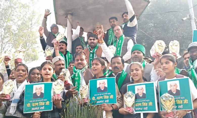 सहारनपुर। भारत रत्न पूर्व प्रधानमंत्री चौधरी चरण सिंह की 123 वीं जयंती पर रालोद कार्यकर्ताओं ने राष्ट्रीय लोकदल खेल प्रकोष्ठ के राष्ट्रीय अध्यक्ष चौ नीरपाल सिंह के नेतृत्व में चौधरी साहब की विचार धारा को जन जन तक पहुंचाने के उद्देश्य को लेकर पद यात्रा निकाली। इस अवसर अंजलि सैनी, आरती, शुमाइना, अंशिका, वर्षा, खुशी सहित 31 खिलाड़ी बेटियों को चौ चरण सिंह चौक पर ही चरण सिंह अवॉर्ड से सम्मानित किया गया। पूर्व घोषित कार्यक्रम के अनुसार सभी रालोद कार्यकर्ता हसनपुर चुंगी पर एकत्रित हुए। जहां से सभी नेता कार्यकर्ताओं के साथ पद यात्रा करते हुए दिल्ली रोड, कोर्ट रोड, दीवानी तिराहे से सदर थाना रोड होते हुए चौधरी चरण सिंह चौक पर पहुंचे जहां पर चौधरी साहब की मूर्ति पर माल्यार्पण कर सच्ची श्रद्धांजलि दी।