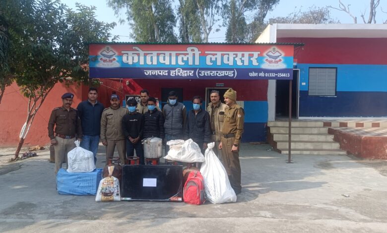 हरिद्वार। लक्सर पुलिस ने घने कोहरे और एकांत का फायदा उठाकर सरकारी स्कूलों व आंगनबाड़ी केंद्रों में चोरी की वारदातों को अंजाम देने वाले शातिर चोर गिरोह का पर्दाफाश करते हुए चार शातिर चोरों को गिरफ्तार किया है। पुलिस ने आरोपियों के कब्जे से लगभग 3.50 लाख रुपये का चोरी का सामान भी बरामद किया है। कोतवाली प्रभारी राजीव रौथाण ने जानकारी देते हुए बताया कि लक्सर क्षेत्र के भूरना व भूरनी गांव में स्थित प्राथमिक विद्यालय, आंगनबाड़ी केंद्र व किसान इंटर कॉलेज में अलग-अलग दिनों में लगातार चोरी की घटनाएं सामने आई थीं। इन घटनाओं को लेकर कोतवाली लक्सर में चार मुकदमे दर्ज किए गए थे। चोरी की बढ़ती वारदातों से क्षेत्र में दहशत का माहौल बना हुआ था। उन्होंने बताया कि लगातार हो रही चोरी की घटनाओं को गंभीरता से लेते हुए हरिद्वार वरिष्ठ पुलिस अधीक्षक द्वारा तत्काल पुलिस टीमें गठित कर घटनाओं के सफल अनावरण के निर्देश दिए।