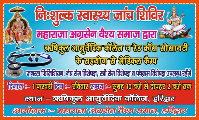 हरिद्वार। महाराजा अग्रसेन वैश्य समाज, हरिद्वार द्वारा ऋषिकुल आयुर्वेदिक कॉलेज, हरिद्वार एवं रेड क्रॉस सोसायटी के सहयोग से एक निःशुल्क मेडिकल कैंप का आयोजन किया जा रहा है। इस शिविर में हरिद्वार के वरिष्ठ एवं अनुभवी चिकित्सकों द्वारा जनरल फिजिशियन, नेत्र विशेषज्ञ, स्त्री रोग विशेषज्ञ, पंचकर्म विशेषज्ञ अपनी निःशुल्क सेवाएँ प्रदान की जाएँगी। इस निःशुल्क स्वास्थ्य जाँच शिविर का शुभारंभ जिलाधिकारी, मुख्य विकास अधिकारी एवं ऋषिकुल आयुर्वेदिक कॉलेज के कुलपति द्वारा किया जाएगा। समस्त ज़रूरतमंद लोगों से विनम्र निवेदन है कि अधिक से अधिक संख्या में पहुँच कर इस जनसेवा रूपी निःशुल्क चिकित्सा शिविर का लाभ उठाएँ।