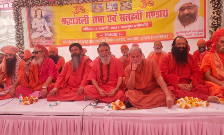 हरिद्वार। श्री पंचायती अखाड़ा बड़ा उदासीन निर्वाण में आयोजित श्रद्धांजलि समारोह में सभी तेरह अखाड़ों के संतों ने ब्रह्मलीन कोठारी महंत निंरजन दास महाराज को श्रद्धांजलि अर्पित की। महंत आत्माराम महाराज की अध्यक्षता और महामंडलेश्वर स्वामी हरिचेतनानंद के संचालन में आयोजित श्रद्धांजलि समारोह को संबोधित करते हुए मुख्य अतिथी अखिल भारतीय अखाड़ा परिषद एवं मनसा देवी मंदिर ट्रस्ट के अध्यक्ष श्रीमहंत रविंद्रपुरी महाराज ने कहा कि सनातन धर्म संस्कृति और मानव कल्याण के लिए जीवन समर्पित करने वाले ब्रह्मलीन महंत निरंजन दास महाराज दिव्य महापुरूष थे। उनकी शिक्षाएं सदैव समाज का मार्गदर्शन करती रहेंगी। श्री पंचायती अखाड़ा बड़ा उदासीन के श्रीमहंत दुर्गादास महाराज ने कहा कि ब्रह्मलीन महंत निरंजन दास महाराज त्याग, तपस्या ओर सेवा की प्रतिमूर्ति थे। अखाड़े की प्रगति में उनका अहम योगदान रहा। उनके दिखाए मार्ग का अनुसरण करते मानव सेवा में योगदान का संकल्प ही उन्हें सच्ची श्रद्धांजलि है। महानिर्वाणी अखाड़े के सचिव श्रीमहंत रविंद्रपुरी महाराज एवं निर्मल अखाड़े के कोठारी महंत जसविंदर सिंह महाराज ने कहा कि ब्रह्मलीन महंत निरंजन दास महाराज संत समाज के प्रेरणा स्र्रोत थे।