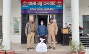 हरिद्वार। बहादराबाद थाना पुलिस को बड़ी सफलता हाथ लगी है, चेकिंग के दौरान बहादराबाद पुलिस ने एक नशा तस्कर को गिरफ्तार करते हुए कब्जे से 21 किलो 560 ग्राम गांजा बरामद किया है, ओर मौके का फायदा उठाकर फरार हुआ एक नशा तस्कर की पुलिस तलाश कर रही है। उत्तराखंड ड्रग्स फ्री देवभूमि मिशन के तहत वरिष्ठ पुलिस अधीक्षक नवनीत सिंह के दिशा निर्देश पर जनपद हरिद्वार में पुलिस द्वारा चलाएं जा रहे अभियान को लेकर नशा तस्करों में हड़कंप मचा हुआ है। बहादराबाद पुलिस ने क्षेत्र अंतर्गत चेकिंग अभियान चलाया हुआ था, चेकिंग के दौरान नहर पटरी के पास दो संदिग्ध व्यक्ति पुलिस को देखकर भागने लगे, पुलिस ने एक व्यक्ति को मौके पर पकड़ लिया और दूसरा फरार होने में सफल रहा।