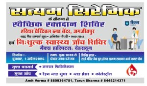 हरिद्वार। सत्यम सिरेमिक के सहयोग से हरिद्वार चैरिटेबल ब्लड सेंटर द्वारा दिनांक 1 अप्रैल 2026, बुधवार को एक स्वैच्छिक रक्तदान शिविर का आयोजन किया जा रहा है। इस शिविर में रक्तदान करने वाले सभी लोगों के लिए निशुल्क स्वास्थ्य जांच की सुविधा भी उपलब्ध होगी। स्वास्थ्य जांच शिविर में मैक्स हॉस्पिटल देहरादून के डॉक्टर्स की टीम सहयोग प्रदान करेगी, जिससे रक्तदाता और उपस्थित लोग अपनी स्वास्थ्य स्थिति की जांच करवा सकेंगे और आवश्यक स्वास्थ्य संबंधी मार्गदर्शन प्राप्त कर सकेंगे।